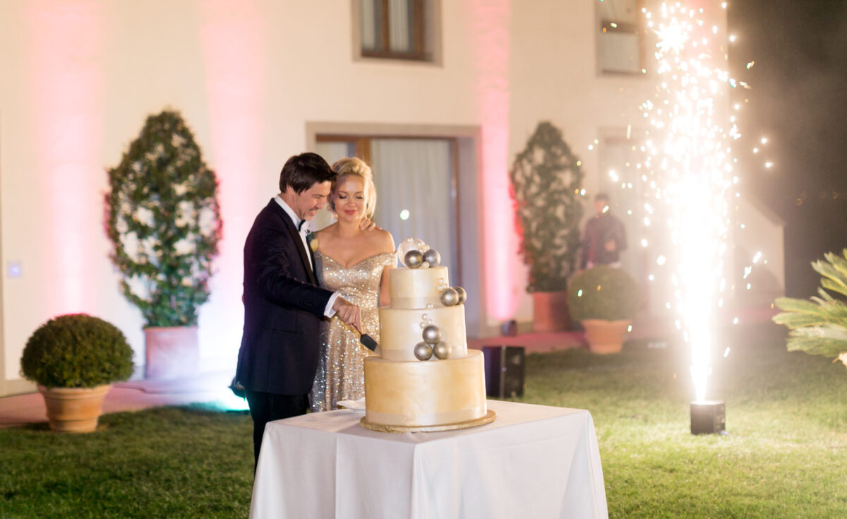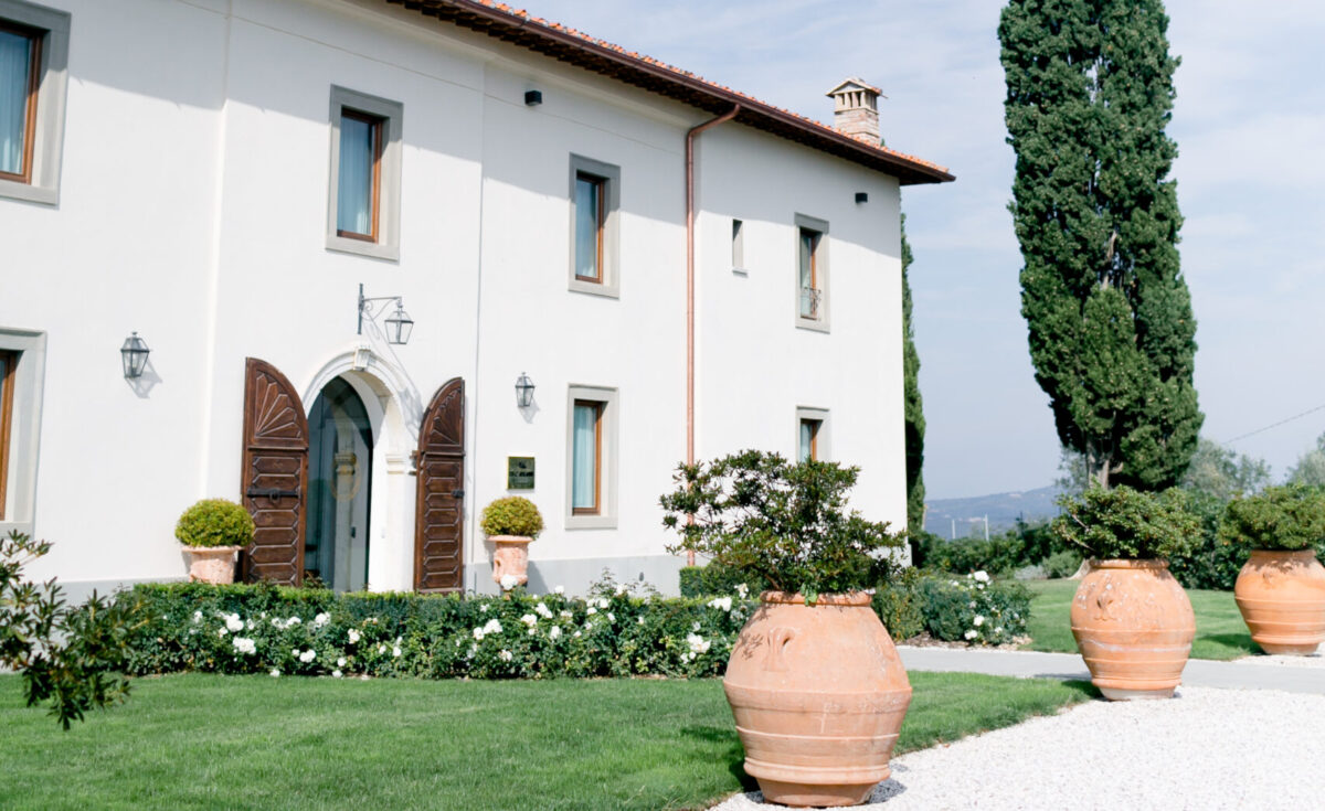 The wedding reception took place at a charming villa in the Tuscan countryside. Family and friends basked in the cozy atmosphere and the jazzy music while sipping bubbly rosé prosecco. The guests also enjoyed an alfresco six-course dinner with a breathtaking view of the Florentine hills.